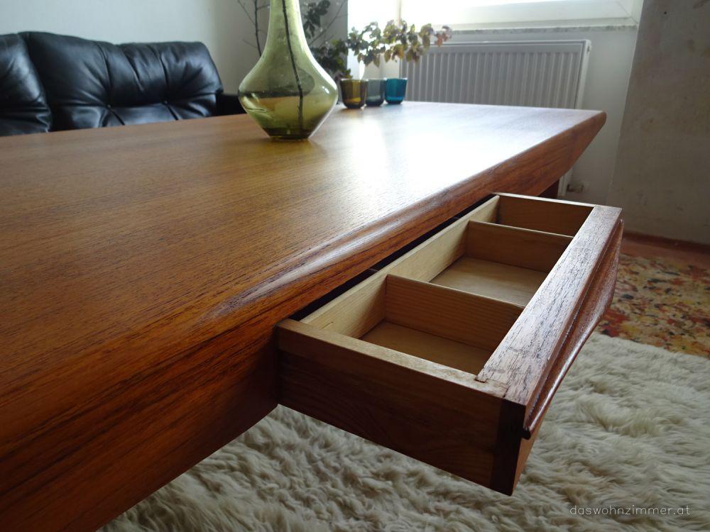 Tisch restauriert: komplett gereinigt, nachgeleimt, per hand geschliffen, mehrfach dünn teak geölt